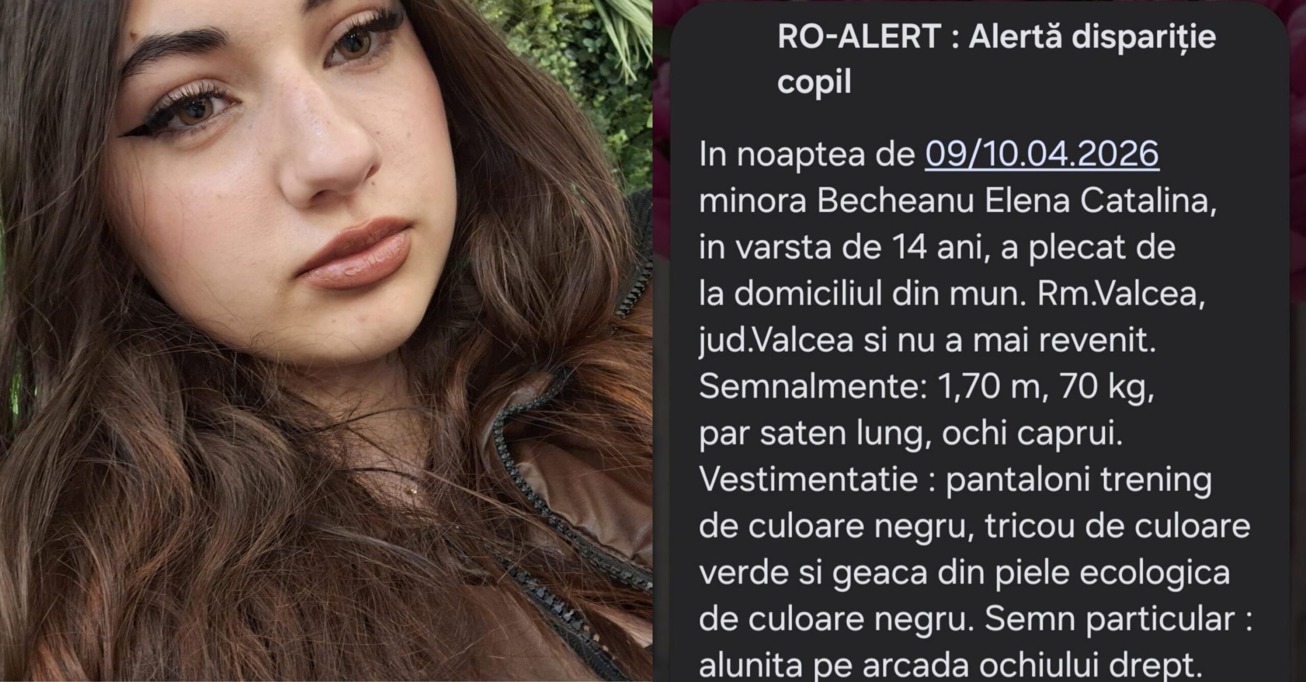 Polițiștii municipiului Râmnicu Vâlcea desfășoară activități de căutare a numitei Becheanu Elena-Cătălina, în vârstă de 14 ani, care ar fi plecat în mod voluntar de la domiciliul său din municipiu, în noaptea de 9 spre 10 aprilie a.c., fără a mai reveni până în prezent.