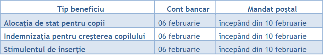 Astfel, vineri, 6 februarie 2026, vor fi efectuate plățile în conturile bancare ale beneficiarilor de alocație de stat pentru copii, indemnizație pentru creșterea copilului și stimulent de inserție.