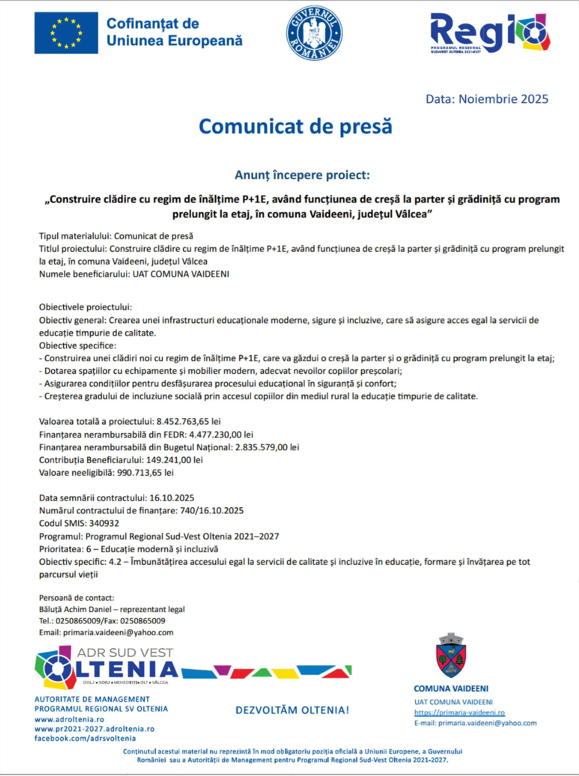 Anunț începere proiect: „Construire clădire cu regim de înălțime P+1E, având funcțiunea de creșă la parter și grădiniță cu program prelungit la etaj, în comuna Vaideeni, județul Vâlcea”