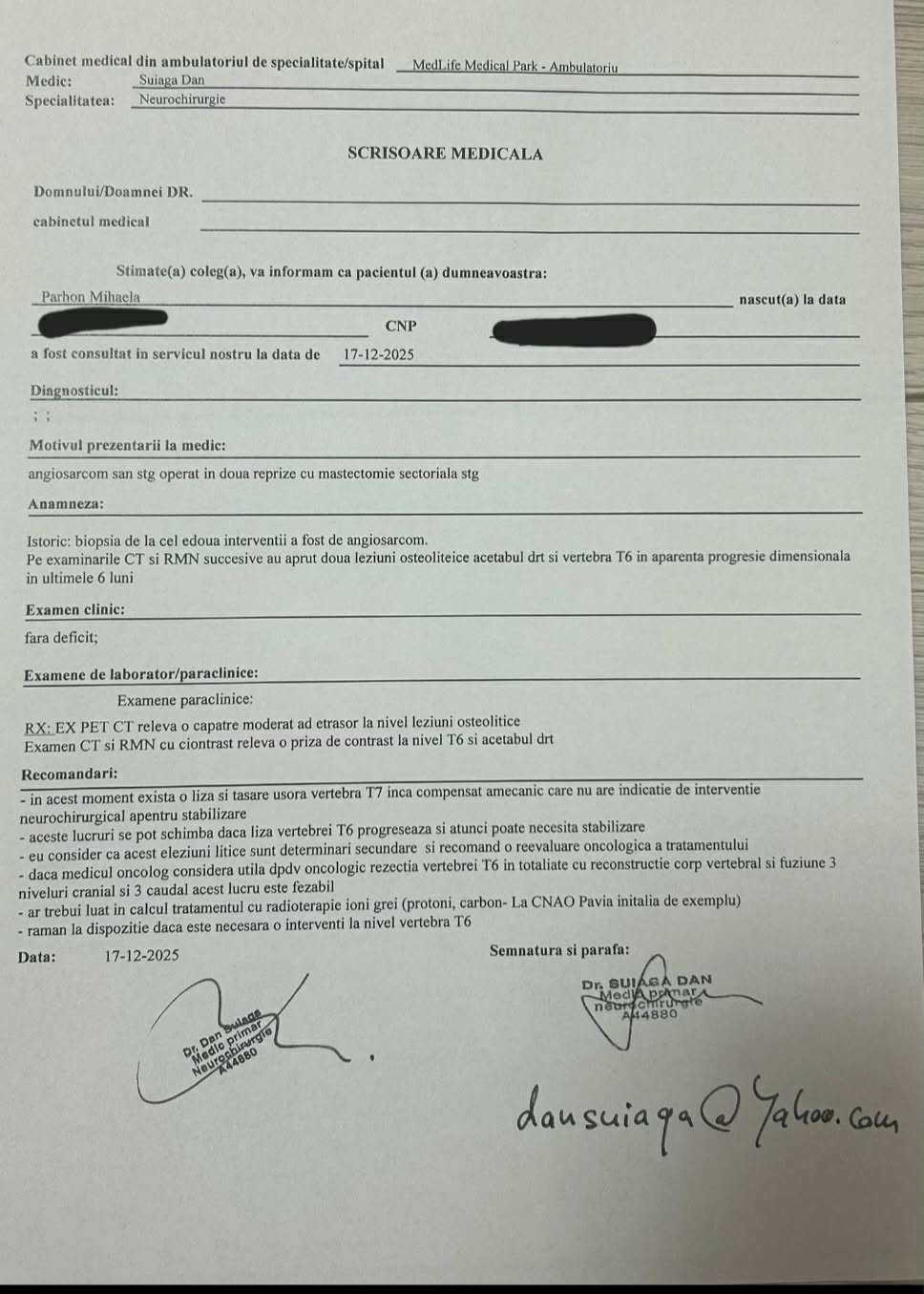 În fața acestui verdict, Daniela a căutat soluții dincolo de granițele țării. A luat legătura cu un medic specialist de la Memorial Sloan Kettering Cancer Center (MSKCC) din Statele Unite, unul dintre cele mai prestigioase centre oncologice din lume, care i-a recomandat reevaluarea probei de biopsie și un tip de radioterapie disponibil doar în câteva centre la nivel global.