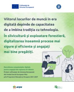Scopul proiectului este acela de a sprijini adaptarea forței de muncă la cerințele economiei digitale, contribuind astfel la consolidarea unei economii verzi, competitive și incluzive prin dezvoltarea de competențe digitale, astfel proiectul își propune să formeze 601 de angajați din Regiunea Sud-Vest Oltenia care activează în sectorul Silvicultură și exploatare forestieră (CAEN 02). Cursurile vor fi adaptate diferitelor niveluri de competență, de la teme de bază la competențe avansate.