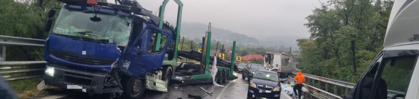 Trafic dat peste cap, joi domineața, pe Drumul Național 7, în zona Baraj Nord din Râmnicu Vâlcea, după ce două autotrenuri au fost implicate într-un accident rutier.