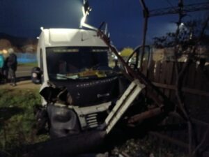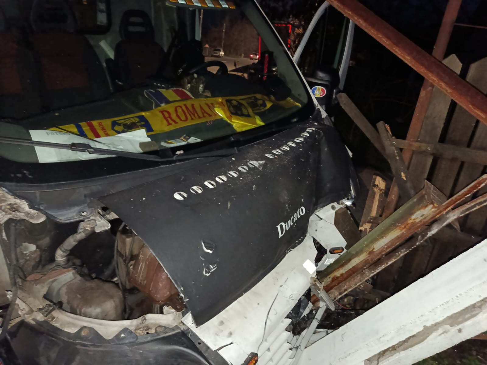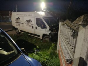 FOTO Coliziune violentă la Popești! Un șofer a aruncat o dubă de firmă direct în gard, după o manevră imprudentă
