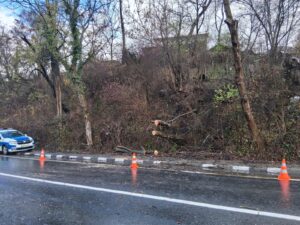 « FOTO Copac prăbușit peste un autoturism aflat în mers, la Vlădești. Trafic dirijat, fără victime