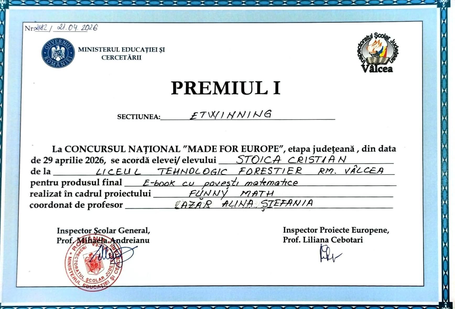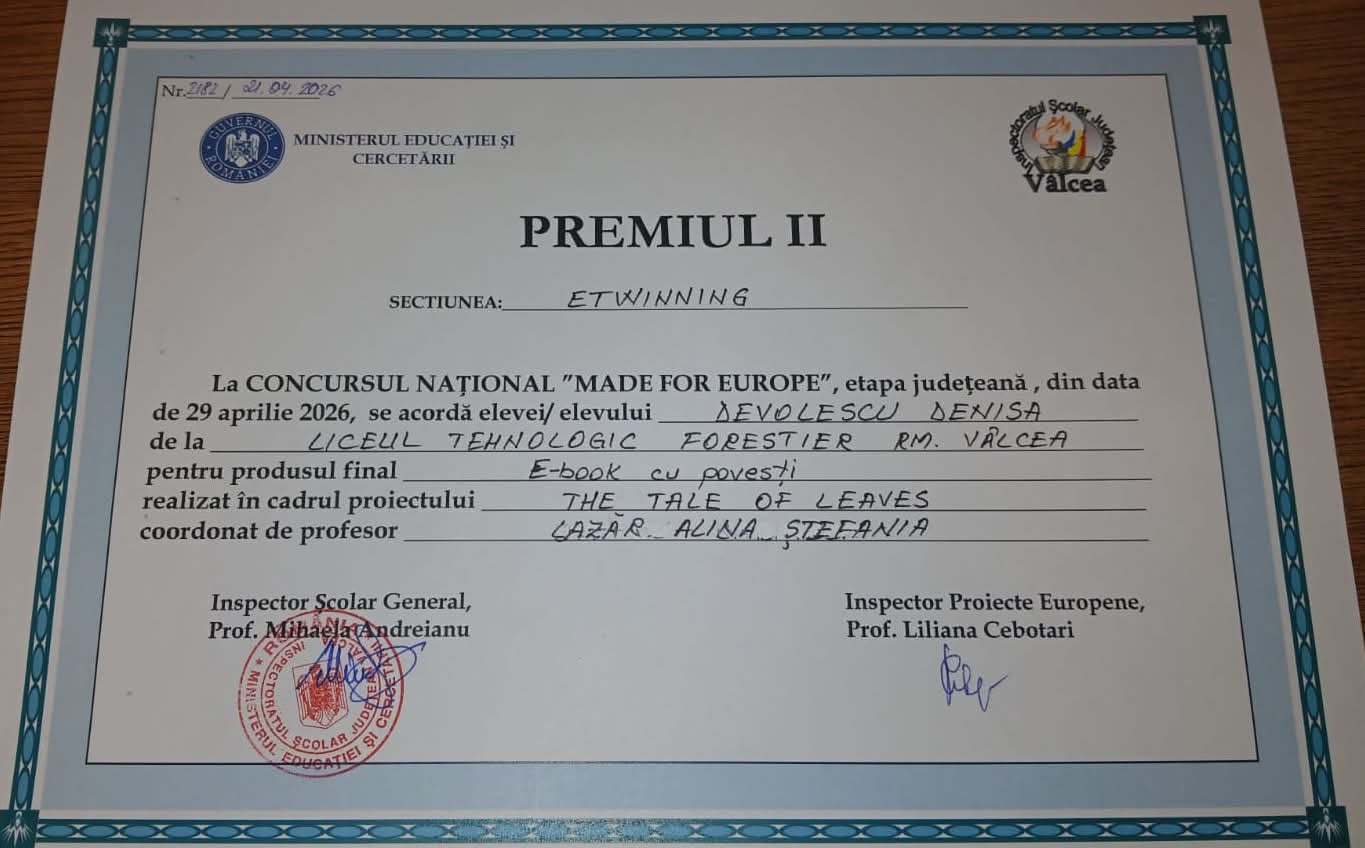 Elevii Liceul Tehnologic Forestier Râmnicu Vâlcea confirmă și în acest an că educația conectată la Europa produce rezultate. La faza județeană a Concursului Național Made for Europe, secțiunea eTwinning, liceenii vâlceni au urcat pe podium, demonstrând creativitate, implicare și competențe digitale de top.