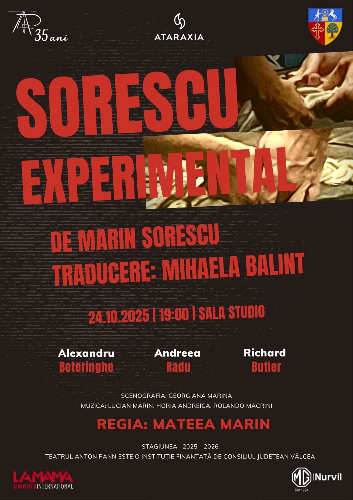 După ce a fost prezentată în variantă work-in-progress în cadrul unei rezidențe artistice la La MaMa Umbria (Spoleto, Italia), unul dintre cele mai importante centre de teatru experimental din lume, Trilogia „Sorescu. Experimental.” își are premiera națională pe 24 octombrie, la Teatrul Anton Pann din Râmnicu Vâlcea, în Sala Studio, de la ora 19:00.