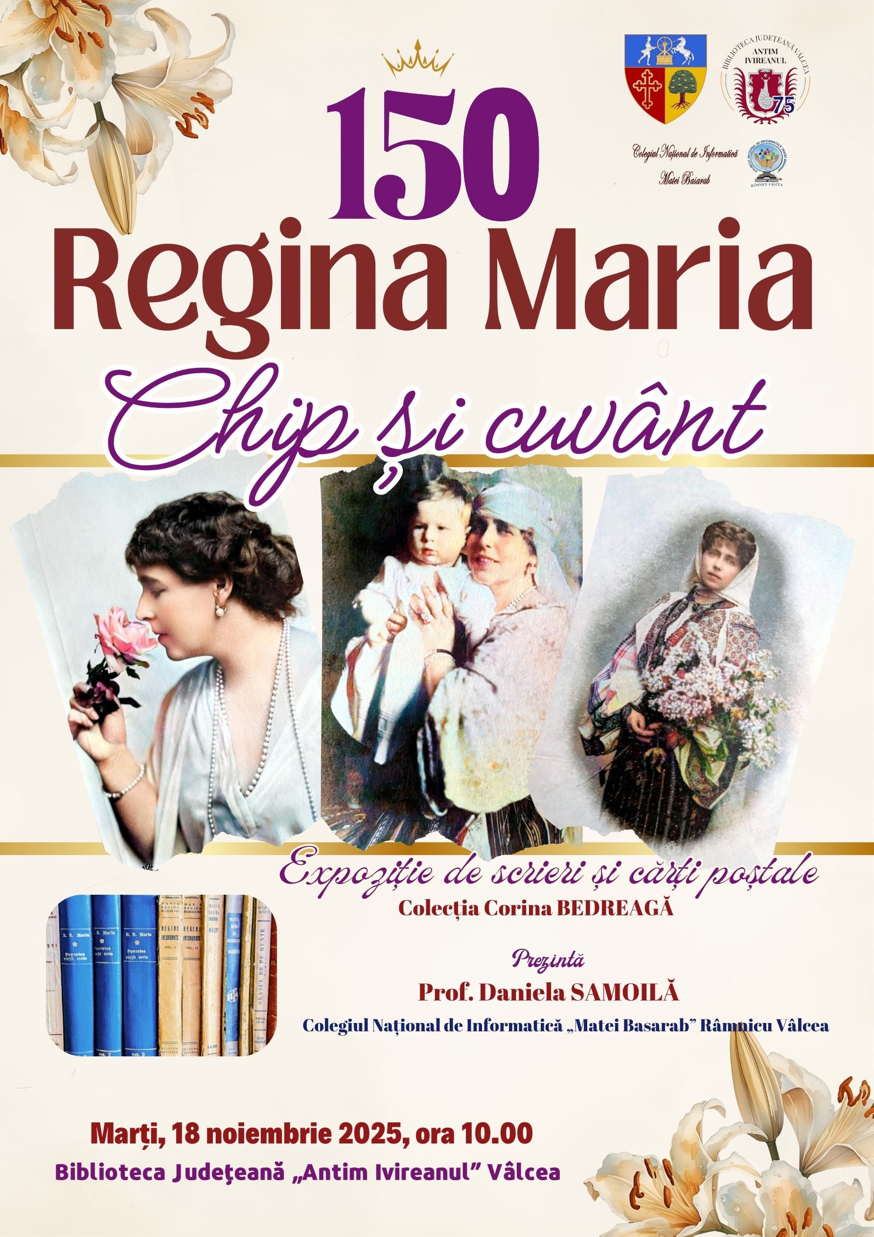 Marți, 18 noiembrie 2025, de la ora 10.00, Biblioteca Județeană „Antim Ivireanul” Vâlcea își invită cititorii și partenerii culturali la un eveniment special dedicat celor 150 de ani de la nașterea Reginei Maria. Expoziția „Regina Maria – Chip și Cuvânt” reunește documente, cărți poștale și fragmente de scrieri care readuc în atenția publicului figura unei suverane ce a marcat destinul României.