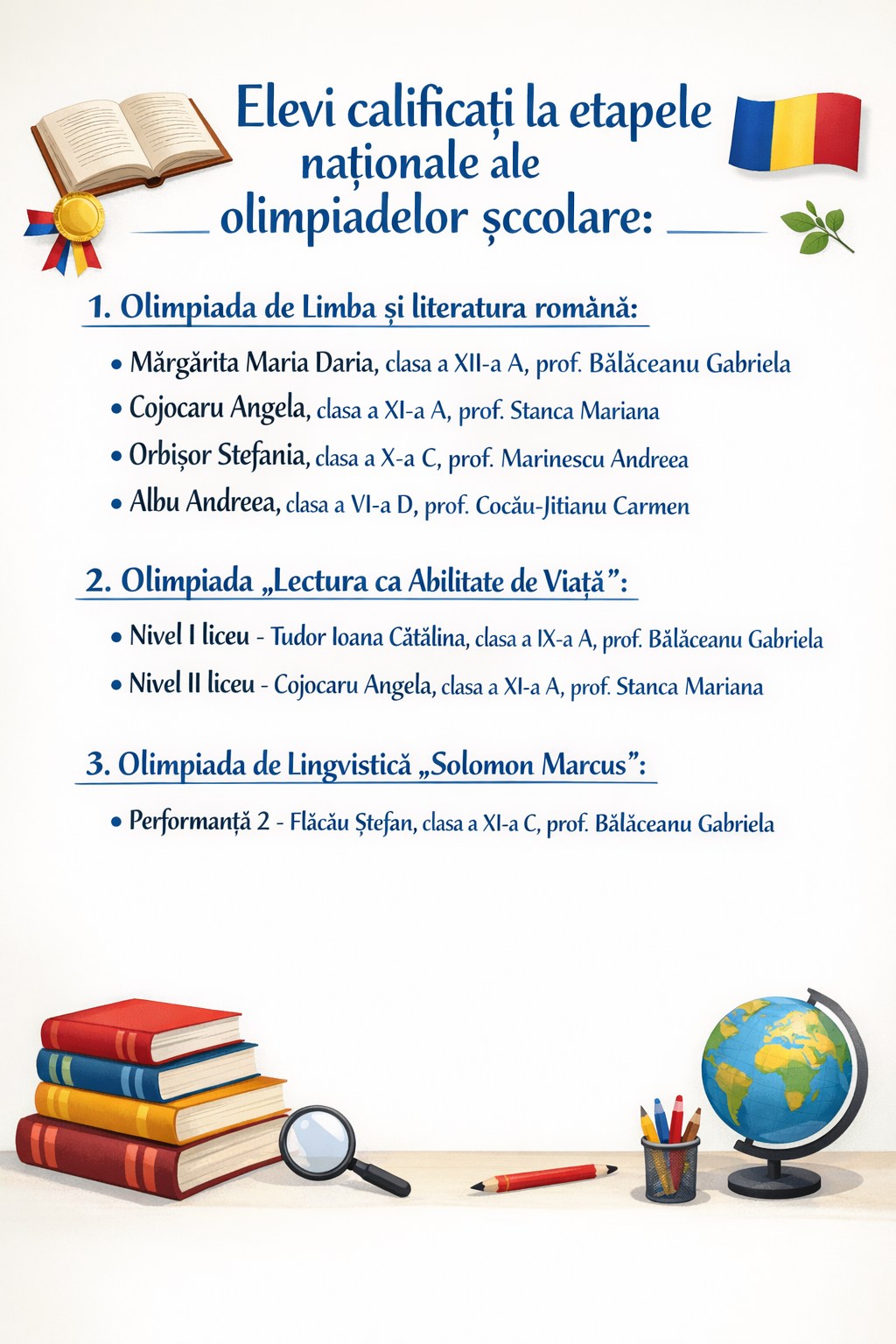 Performanțele continuă și la Olimpiada „Lectura ca abilitate de viață”, unde două eleve au obținut calificarea la etapa națională: Tudor Ioana Cătălina (clasa a IX-a A) și Cojocaru Angela (clasa a XI-a A), aceasta din urmă reușind o dublă calificare, fapt ce subliniază valoarea și constanța sa în competițiile școlare.